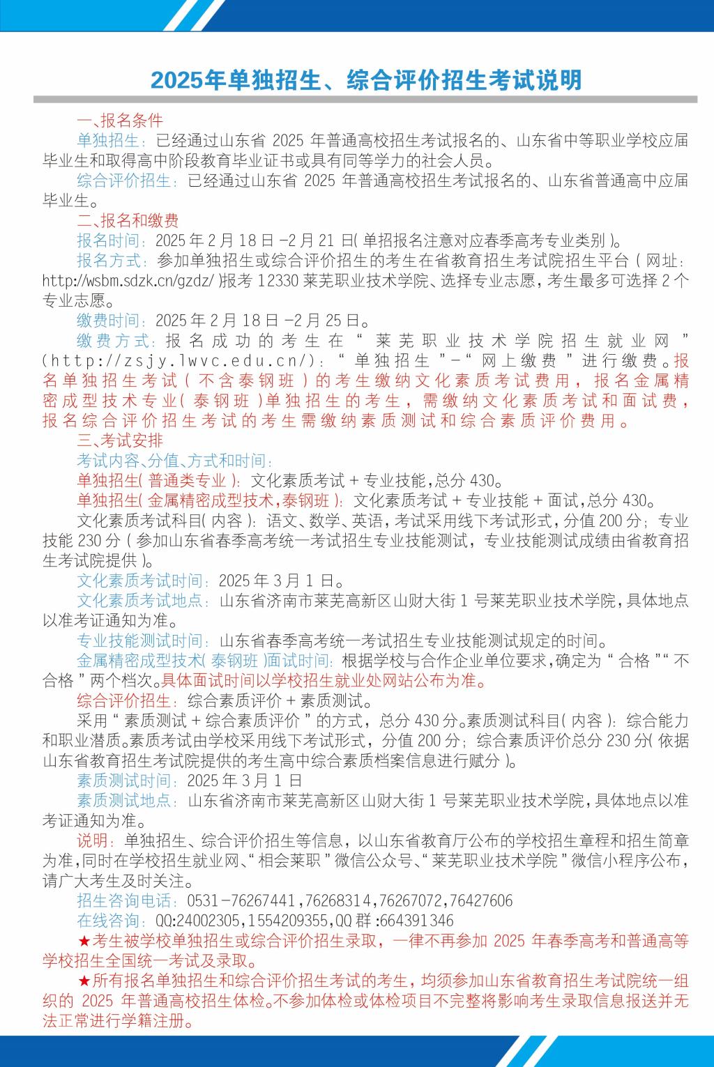 莱芜职业技术学院2025年单独招生、综合评价招生简章