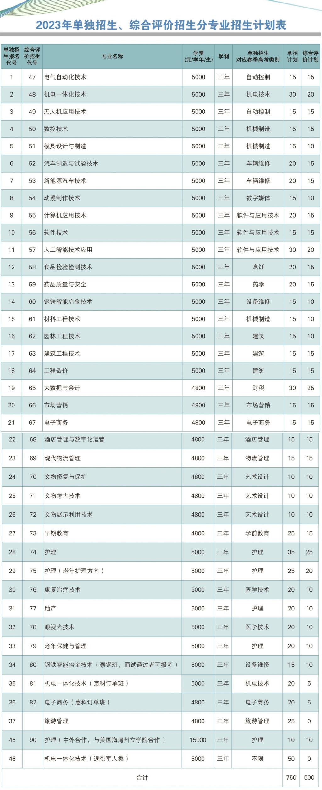莱芜职业技术学院2023年单独招生和综合评价招生计划