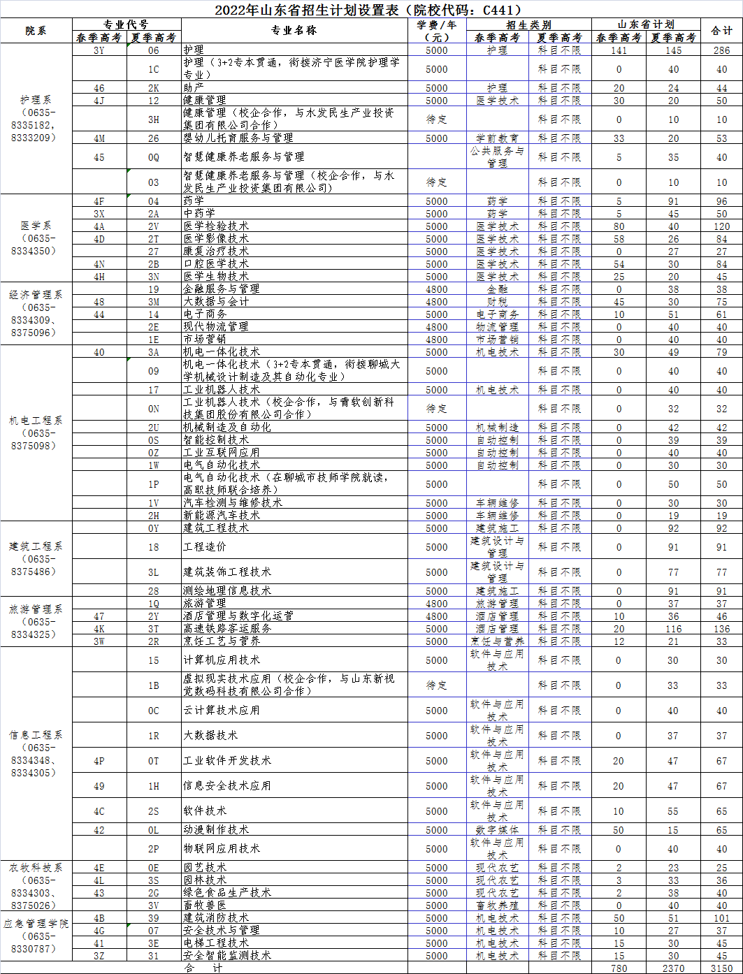 2022年山东省招生计划设置