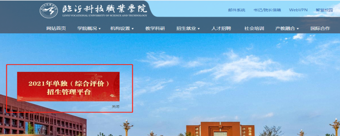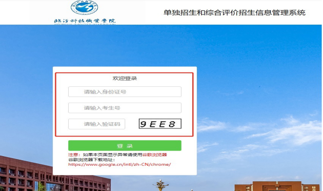 第二步:点击学院网站首页红色图片“2021年单独(综合评价)招生管理平台”,进入系统登录页面,输入身份证号、考生号和验证码登录系统。