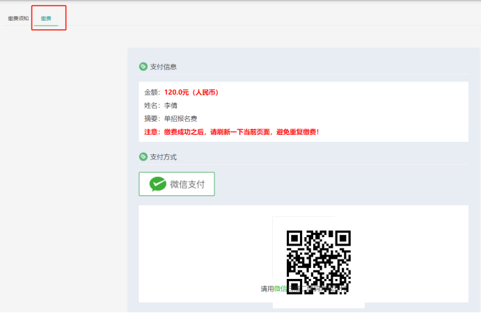 第五步:使用手机微信扫描系统中的二维码完成缴费。
