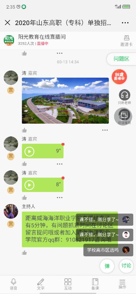 为帮助考生在疫情防控期间更好了解我院情况,搭建与广大考生的沟通平台,做好学院招生宣传工作,3月13日下午,我院联合阳光教育在线开展“微信”直播招生宣传活动,本次直播全程1小时,累计观看3200余人次。