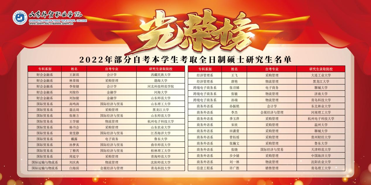 2022年,我院共有33位毕业生考取全日制研究生,其中有4位为2022年专科应届毕业生,通过衔接自考本科学习,比高考同年考入全日制本科的学生抢跑一年读研。今年的录取院校依旧亮眼,中国海洋大学、东北林业大学、河海大学、天津师范大学、杭州电子科技大学、山东师范大学、曲阜师范大学、青岛科技大学、聊城大学等省内外知名高校均在考录榜单之上。