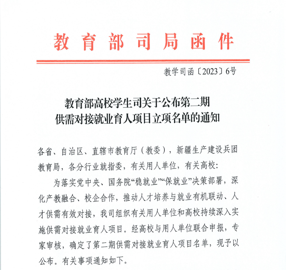 近日,教育部高校学生司发布《关于公布第二期供需对接就业育人项目立项名单的通知》(教学司函〔2023〕6号),学院23个项目获批立项,包含10个定向人才培养培训项目、9个就业实习基地项目和4个人力资源提升项目。学院获批立项数量,居山东省同类型院校前列。