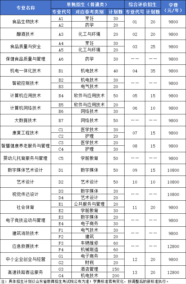 潍坊食品科技职业学院2025年单招综评分专业招生计划