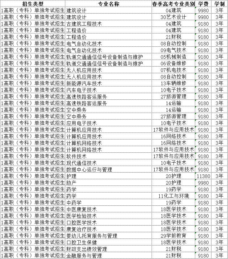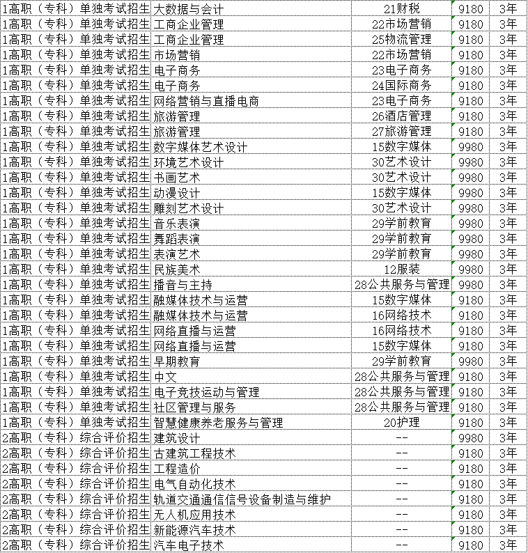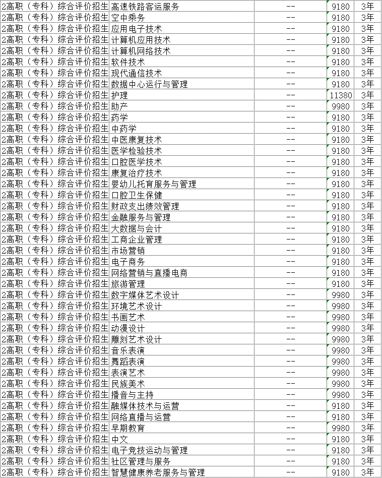 高职(专科)单独招生和综合评价招生专业学费一览表