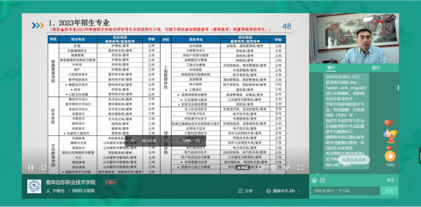 学院党委委员、院长助理尹德亮通过直播的方式详细介绍了学院发展历程、师资队伍、学科建设、人才培养特色、专升本、征兵入伍、就业前景、奖助政策等重点内容做统一介绍,并与考生和家长进行线上互动,在线解答各种专业及招生政策等相关问题,通过细致耐心解答,解决了考生及家长关于报考的疑惑。本次直播活动持续1个小时左右,累计观看人数近万人次。