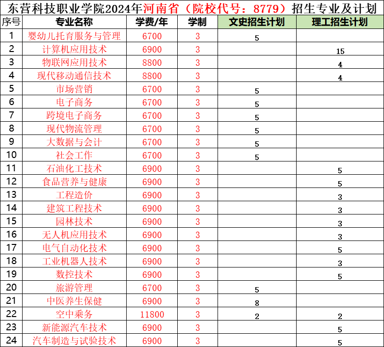 东营科技职业学院2024年河南省各招生批次及专业计划