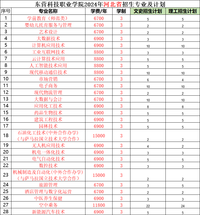 东营科技职业学院2024年河北省各招生批次及专业计划