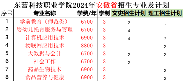 东营科技职业学院2024年安徽省各招生批次及专业计划