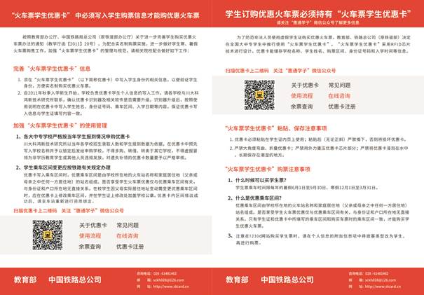 各大、中专院校: 根据中国铁路总公司已全面开通电子客票的现状,火车票购票模式发生改变,目前要求学生每个学年必须进行优惠资质绑定才能正常购买学生票,为了广大学生能够顺利购票、乘车,现将学生购买优惠火车票资质绑定的相关情况作以下说明: 一、什么是资质绑定 资质绑定是指学生出具自己的学生证、身份证、优惠卡,在车站售票窗口或自动售票机上办理的一次学生身份核验,以核实学生身份的真实性和购票优惠资格的有效性(包括是否在读)。 二、如何绑定学生资质 1、每学年的10月1日至下学年的9月30日为一个优惠年度,一个优惠年度内,学生只能购买4次学生优惠票。 2、每个优惠年度内必须进行一次资质绑定(以证明仍然在读),之后才能享受电子客票服务。 3、资质绑定有三种方式: (1)学生未绑定资质先在网上购票,乘车前必须到车站取票(取票时完成优惠资质绑定); (2)学生提前到车站进行资质绑定,之后再网上购票; (3)学生直接到车站窗口或自动售票机购票(购票时完成优惠资质绑定)。 注意:每个优惠年度内未绑定资质前所购车票,不支持直接持证验证检票,必须先取纸质车票(点取报销凭证)。 三、注意事项 1、到车站绑定资质前,请先在学校核实优惠卡内信息是否能够正常显示,确认优惠卡内所写区间是否为标准站名,确认身份信息与本人是否一致。 2、如果学生所乘车次没有开通电子客票服务,则仍按原有方式购票乘车(取票进站乘车)。 3、学生在火车站窗口或自助售取票机绑定学生资质时,由于优惠卡内区间写入不规范(例如:四川成都、成都市、成都站等不规范的站点名称)导致无法绑定学生资质。请回学校找到优惠卡信息管理的老师,修改优惠卡内不规范的站点名称(注意:学生优惠卡内区间修改后必须至火车站重新绑定学生资质,再进行购票)。正确的站点应写入“成都、成都东、成都西或成都南”。 注意:写卡电脑需联网,以便软件和站点自动更新。为确保站点录入正确,老师所使用的优惠卡写卡软件系统需升级到V4.06版本及以上版本(手动升级及下载网站:www.stcard.cn)。 请老师能够积极配合,使用最新版本软件,查看学生优惠卡区间正确与否,确保各学生能够顺利购票、乘车。