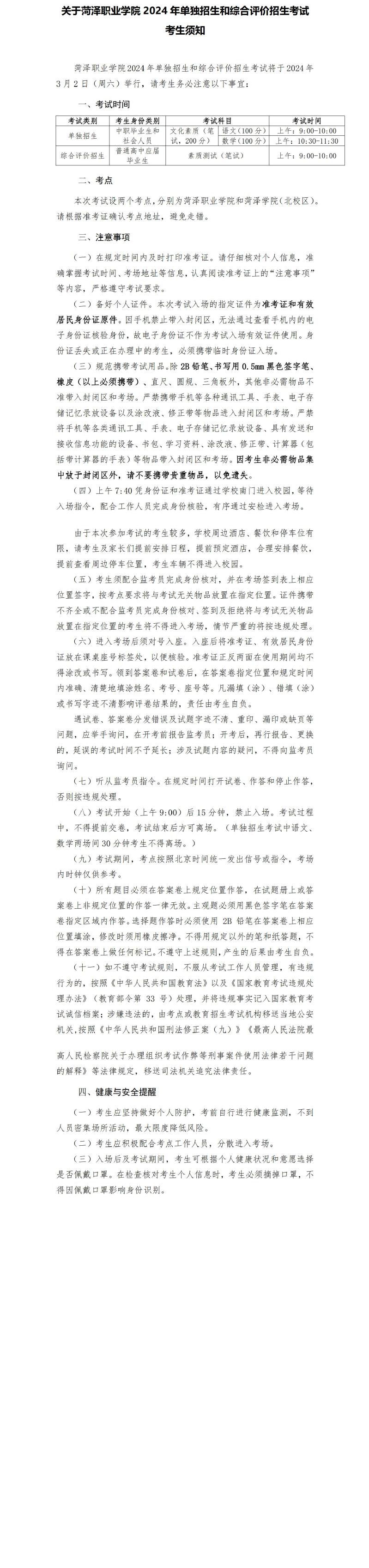 关于菏泽职业学院2024年单独招生和综合评价招生考试考生须知