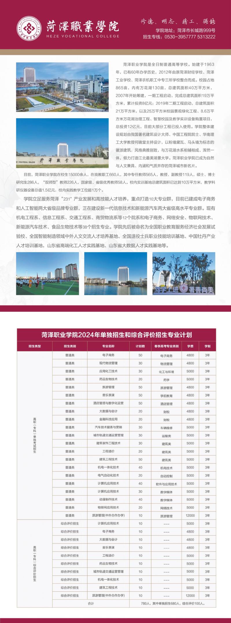 菏泽职业学院2024年单独招生和综合评价招生专业计划