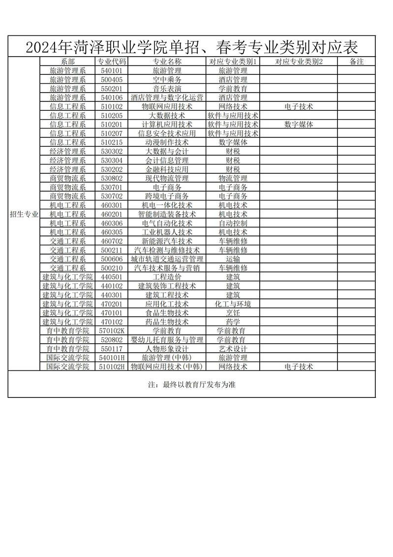 2024年菏泽职业学院单独招生、春季高考专业类别对应表