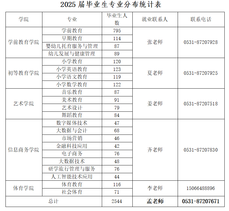 2025年我校共有毕业生2544人,其中师范类毕业生1657人,非师范类毕业生887人,具体专业和毕业生人数见下表: