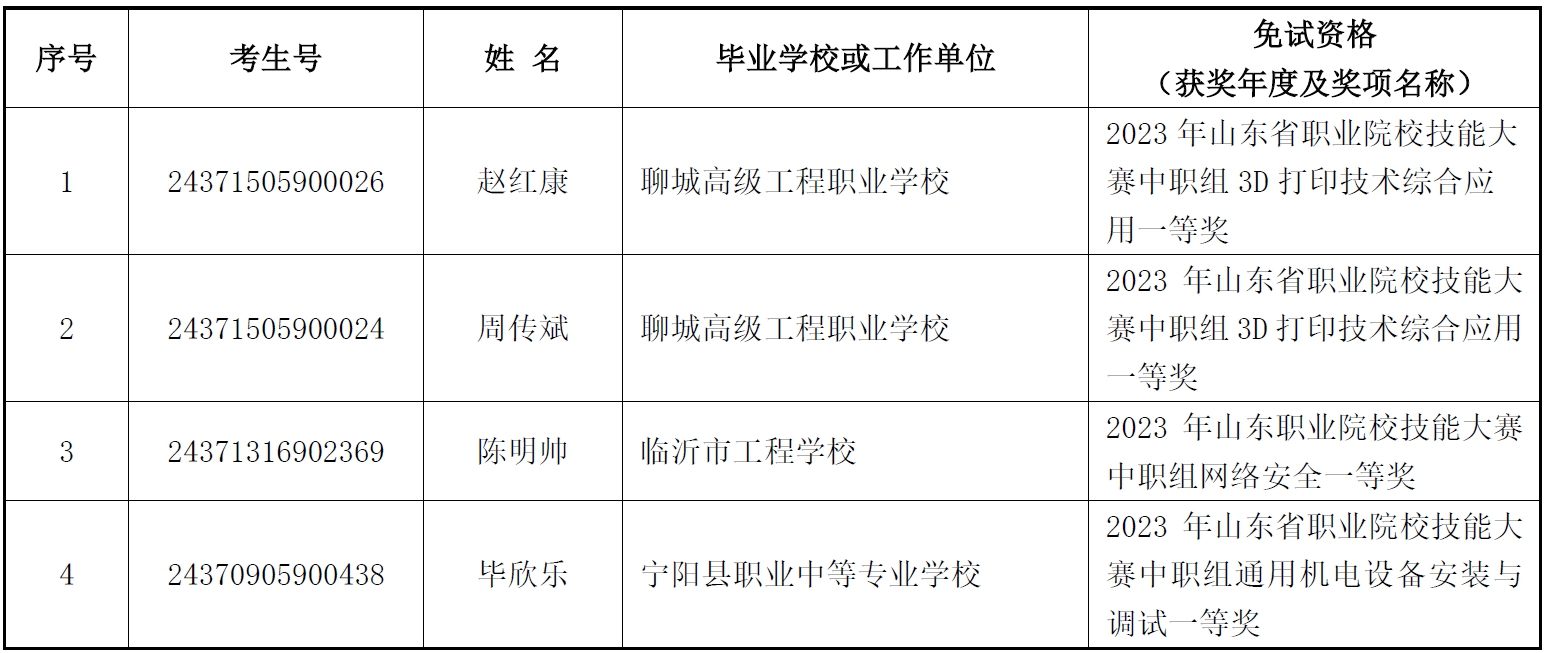 根据山东省教育厅《山东省教育厅关于做好2024年高职(专科)单独考试招生和综合评价招生工作的通知》(鲁教学函〔2023〕28 号)《山东职业学院2024年高职(专科)单独考试招生和综合评价招生章程》要求,按照考生申报、学校初审、教育主管部门最终审核流程,我校初审通过单独考试招生免试考生4人,现予以公示。公示结束后将免试考生相关材料报送上级教育主管部门,最终符合免试资格考生名单以上级教育主管部门审核为准。