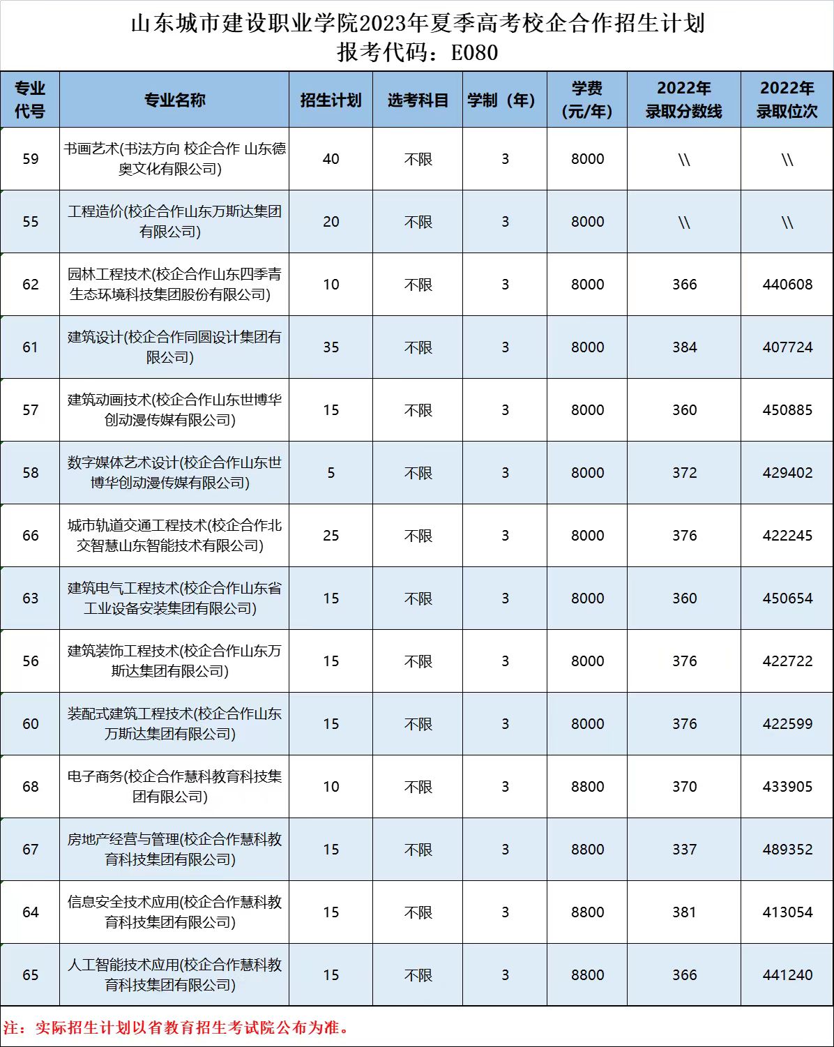 山东城市建设职业学院2023年夏季高考校企合作招生计划