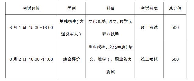 (2)综合评价招生采取学业水平评价与线上考试相结合的方式。学业水平评价根据高中学业水平考试成绩赋分占比40%,计200分;考试内容包括文化素质(语文+数学)和职业能力测试,文化素质100分,职业能力测试200分;总分500分,考试时间为60分钟。