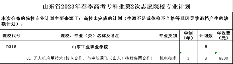 山东工业职业学院在山东省夏季高考普通类常规批第2次志愿、春季高考专科批第1次志愿投档录取完成后,仍有部分招生专业将参加山东省春季高考专科批第2次志愿填报。