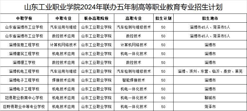 山东工业职业学院2024年初中后联办五年制高职招生计划