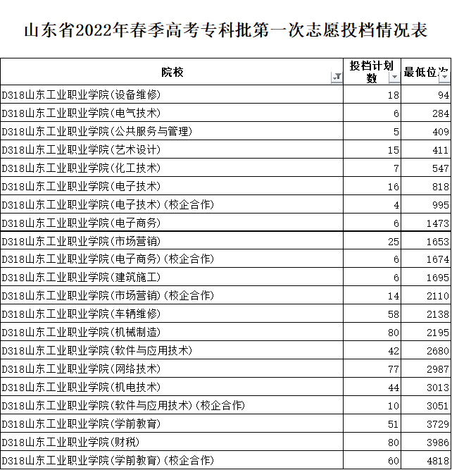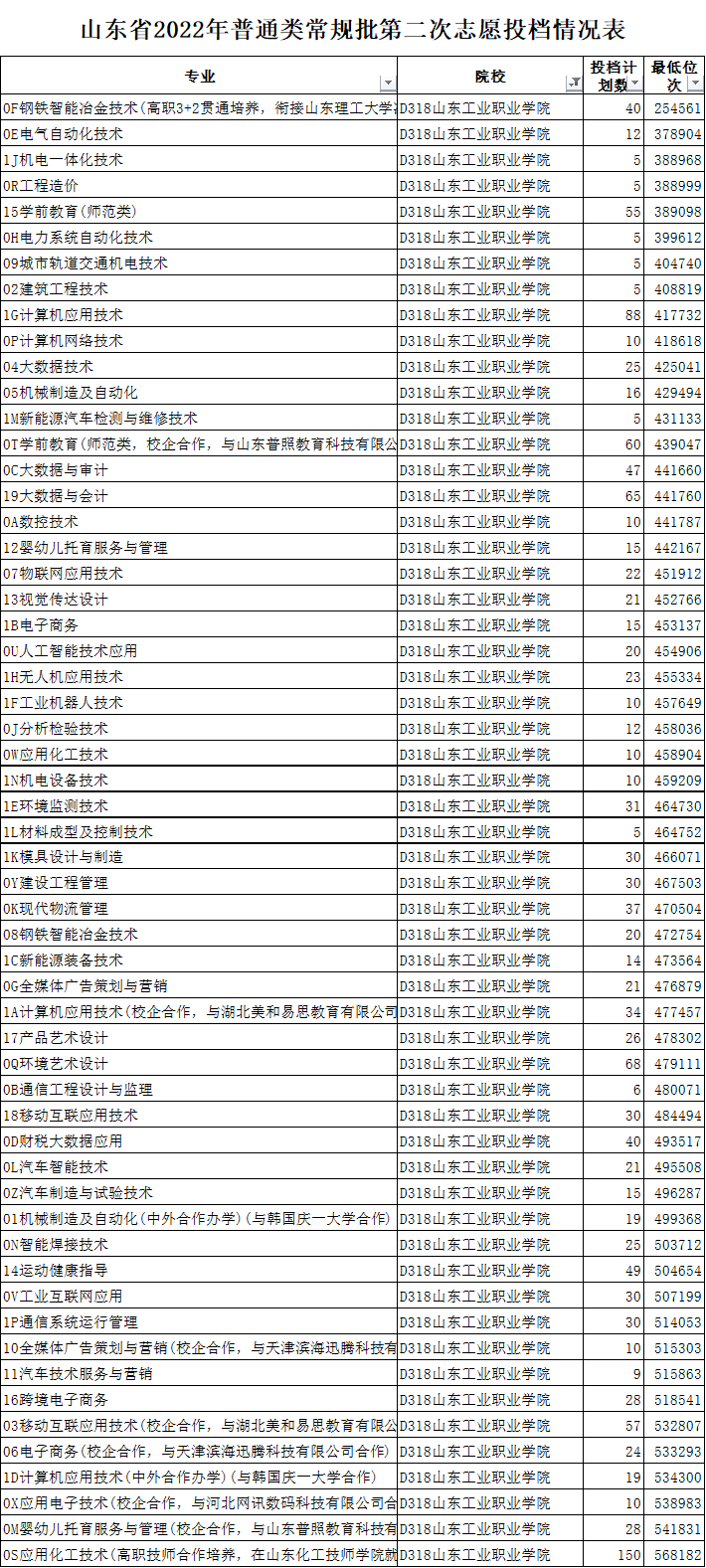 山东工业职业学院2022年山东省专科普通批首次志愿录取情况统计表