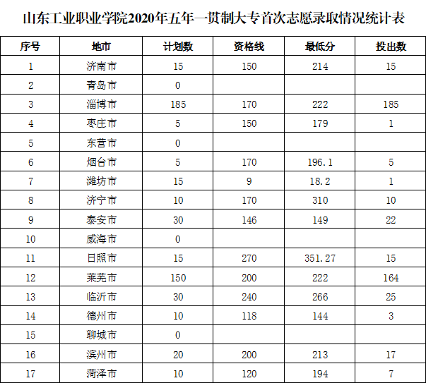 山东工业职业学院2020年五年一贯制大专首次志愿录取情况统计表