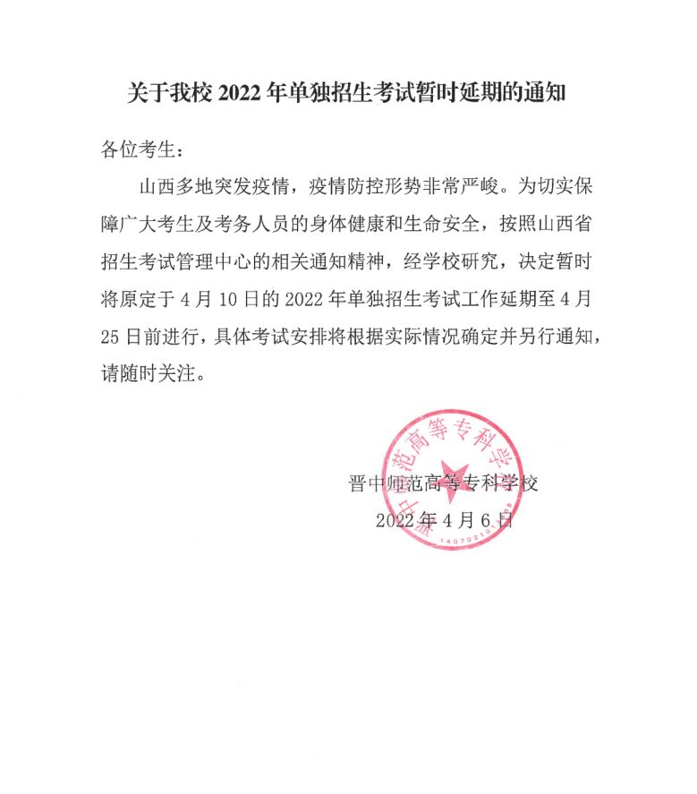 山西多地突发疫情,疫情防控形势非常严峻。为切实保障广大考生及考务人员的身体健康和生命安全,按照山西省招生考试管理中心的相关通知精神,经学校研究,决定暂时将原定于4月10日的2022年单独招生考试工作延期至4月25日前进行,具体考试安排将根据实际情况确定并另行通知,请随时关注。