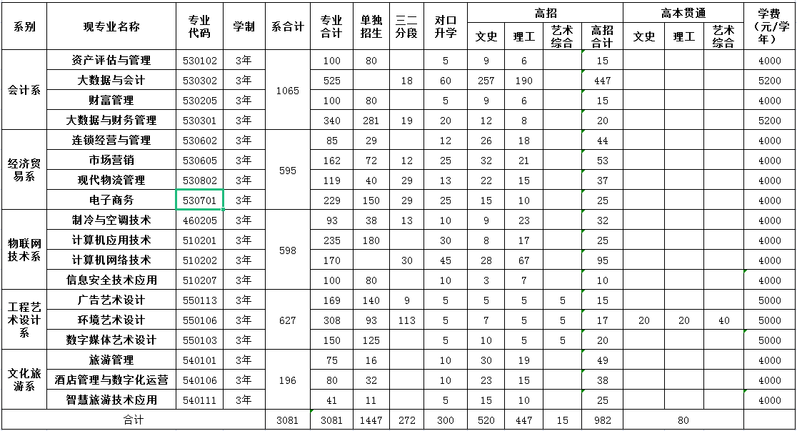 山西财贸职业技术学院2022年分专业招生计划