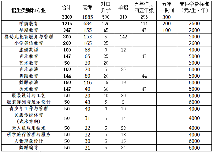 2024年学校将继续面向全国招收“文史、理工、艺术”类高考学生;面向全省招收“对口升学、五年一贯制”专科生;同时“婴幼儿托育服务与管理、舞蹈表演、音乐表演、旅游英语、服装设计与工艺、青少年工作与管理、民族传统体育(武术方向)、无人机应用技术、服装陈列与展示设计、人物形象设计、舞蹈编导、研学旅行管理与服务”12个非师范专业计划招收“高考单招”学生。