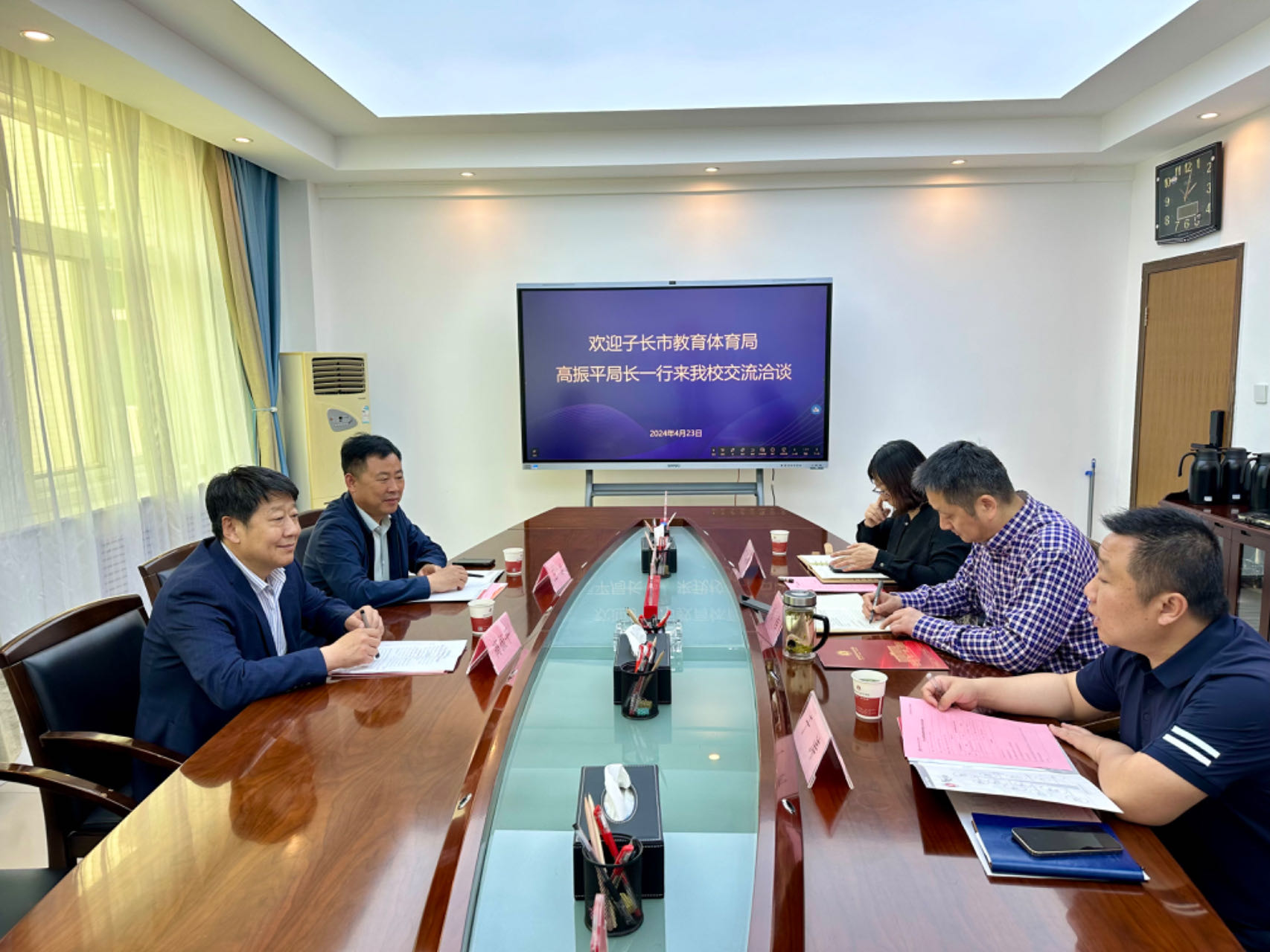 4月23日下午子长市教育体育局党委书记、局长高振平、子长市职业教育中心校长王岩一行来我校洽谈交流职业教育帮扶工作。会议间隙,党委书记刘予东会见了高振平一行。副校长刘浩、招生就业处、煤化学院负责人参加座谈,会议由于涛主持。