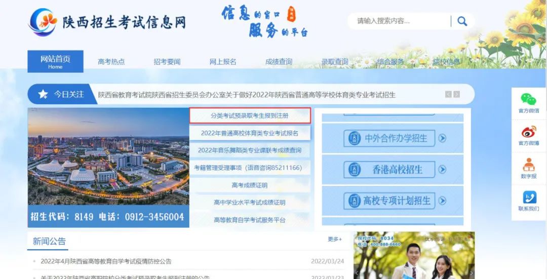 被我院预录取考生登录陕西省教育考试院门户网站(网址:https://www.sneea.cn)或陕西招生考试信息网(网址:https://www.sneac.com),进入“分类考试预录取考生报到注册”页面。