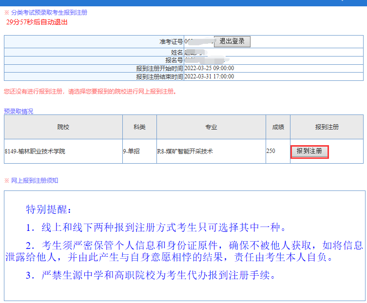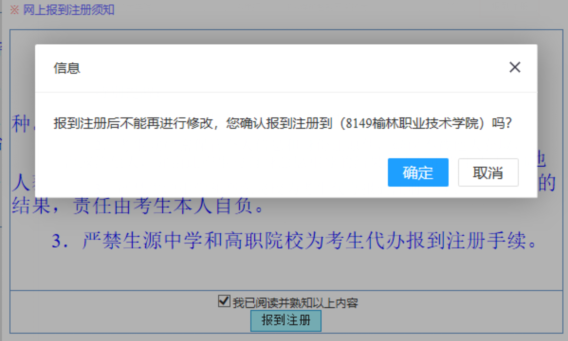 选择【8149,榆林职业技术学院】,确认报到注册。