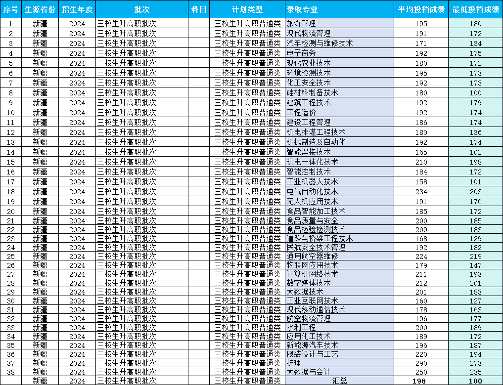 2024年新疆三校生升高职批次录取最低分数线