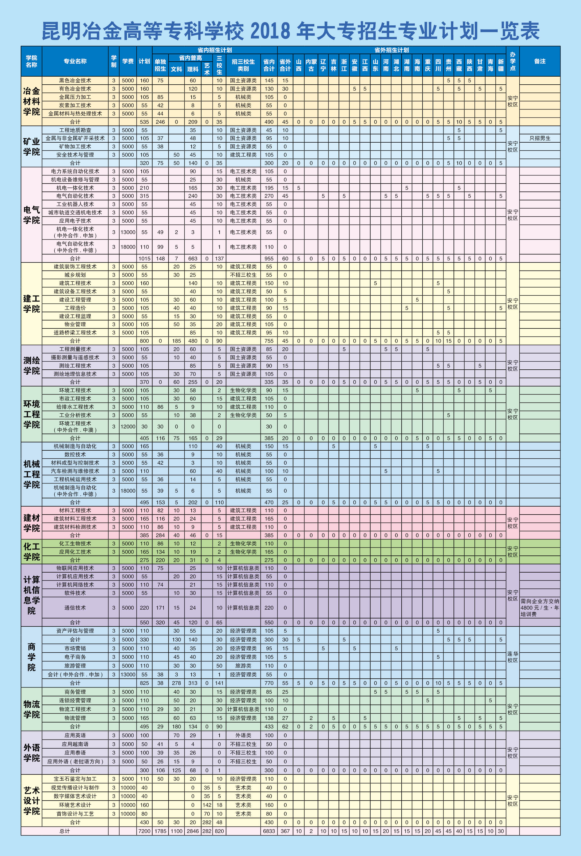 2018年昆明冶金高等专科学校大专招生专业计划表
