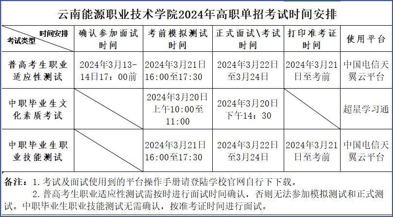 (4)确认参加测试时间:考生须在2024年3月13日至14日17:00前登录云南能源职业技术学院官网(http://www.ynny.cn/),选择测试时间,核对、填写本人相关信息后完成面试时间确认。未在规定时间内进行普高职业适应性测试时间确认的考生无法参加后续面试。