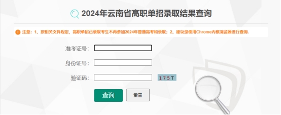 3.在“2024年云南省高职单招录取结果查询”查询界面,输入本人准考证号、身份证号单击“查询”,考生查询结果为最终录取结果。