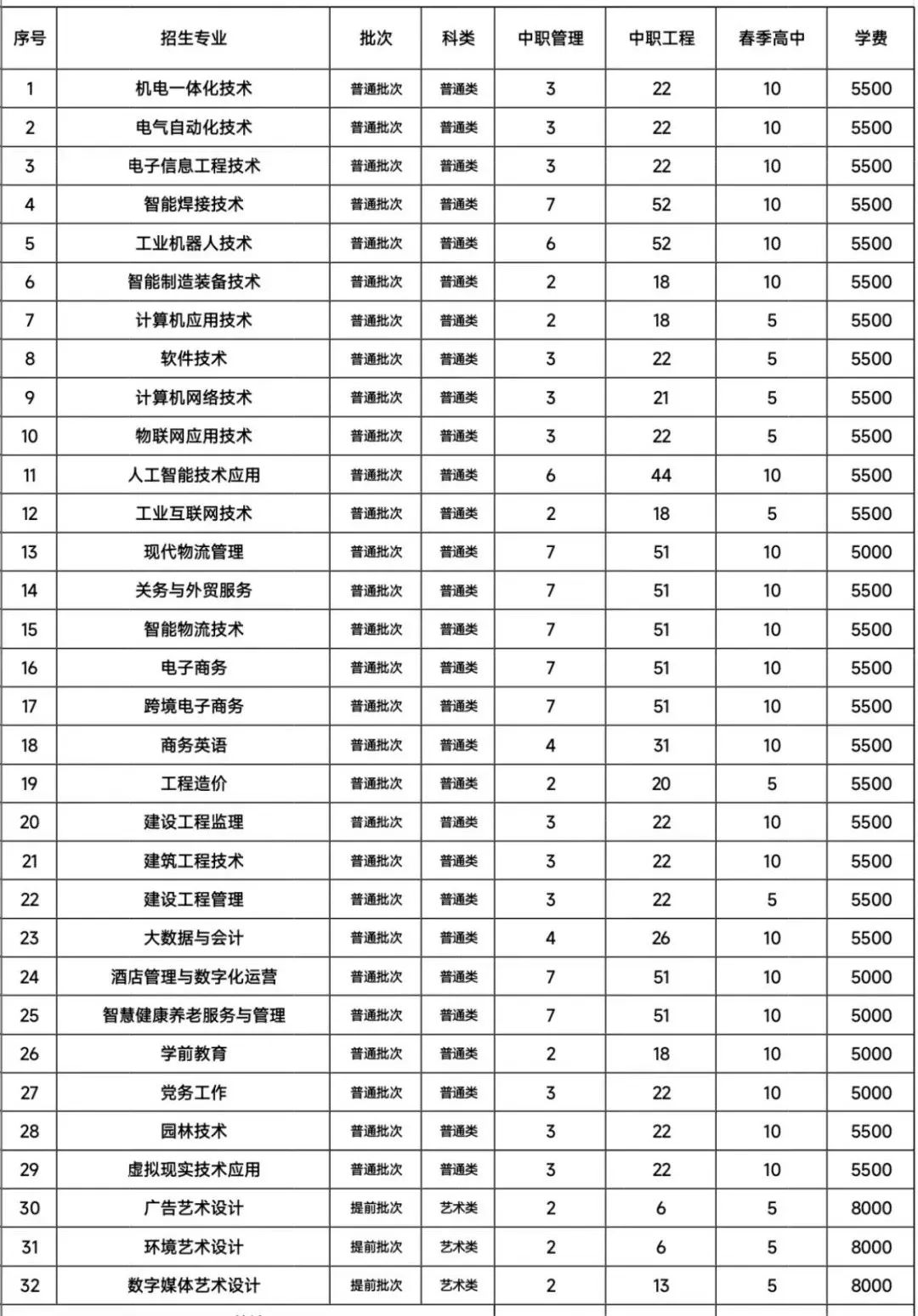 学校设有南、北两个校区,学校本部设在北校区,共占地1000亩,建筑面积22万平方米。分设智能制造、人工智能、商贸物流、智慧建造、现代服务管理、数字创意6个二级学院,32个招生专业,现有全日制在校生7800余人,在籍成人教育学生3000余人。