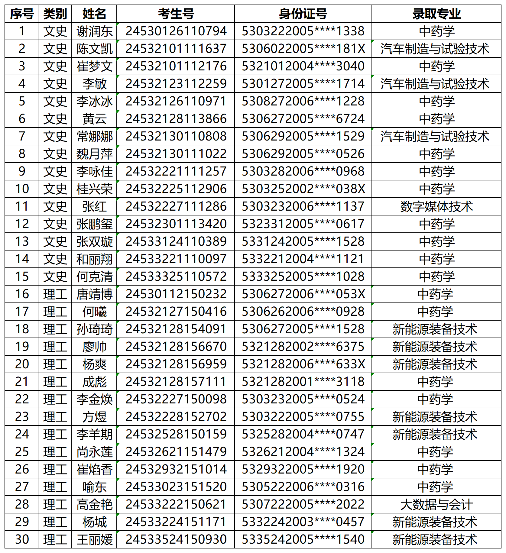 各位考生:感谢您选择铜川职业技术学院!我院在云南省高考录取工作已经结束:计划30名,录取30名;其中文史15名,理工15名。现将录取名单予以公布。在今后的日子里,让我们一起奋楫扬帆,逐梦未来。