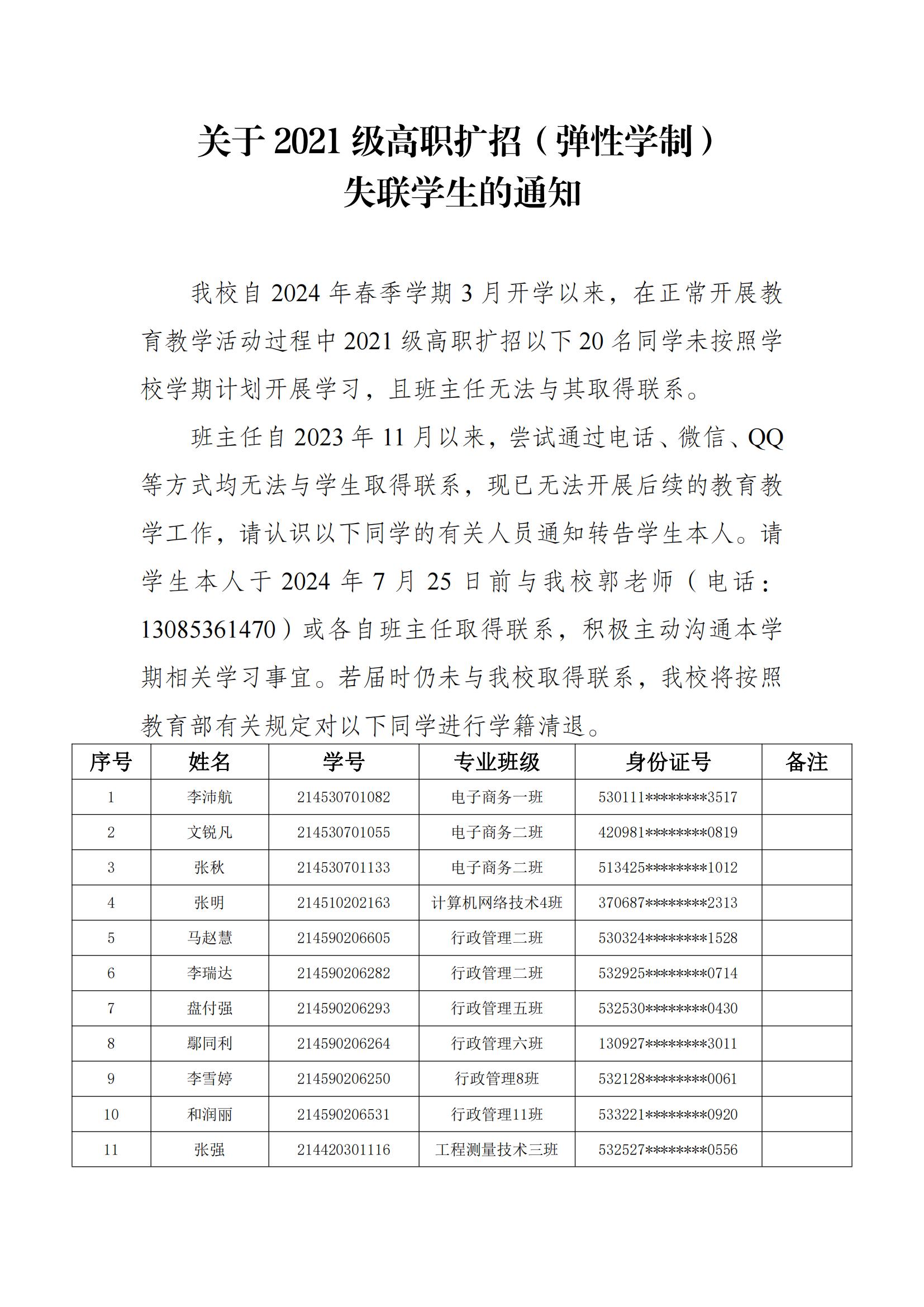 关于 2021 级高职扩招(弹性学制)失联学生的通知