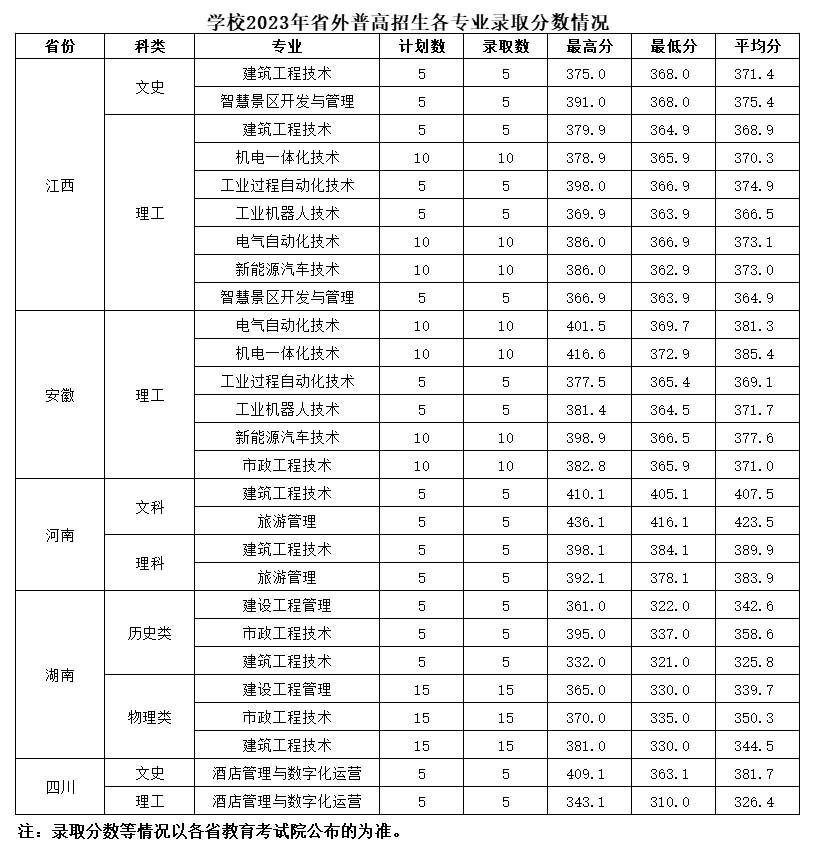 湖州职业技术学院2023年省外普高招生各专业录取分数情况