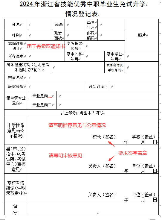 2024年浙江省技能优秀中职毕业生免试升学情况登记表.docx