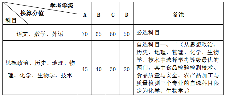 2.普高招生考生高中学考等级要求:①无E等级;②语文、数学、外语为必选科目;③自选科目两门,从思想政治、历史、地理、物理、化学、生物学、技术中选择学考等级最优的两门,其中食品检验检测技术、食品质量与安全、农产品加工与质量检测三个专业的自选科目限定为化学、生物学;④高中学考等级以浙江省教育考试院提供的成绩为准。