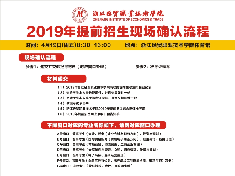 普高招生考生 | 1、技能测试(笔试)时间:上午8:30-10:00 2、面试时间:参加第一场测评的考生须在11:30前到候考区集中,参加第二场测评的考生须在14:00前到候考区集中。详见《浙江经贸职业技术学院2019年提前招生综合测评实施细则》 |