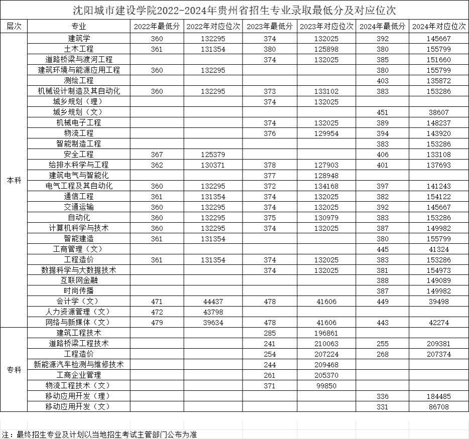 贵州2022-2024年招生专业录取最低分数线及对应位次