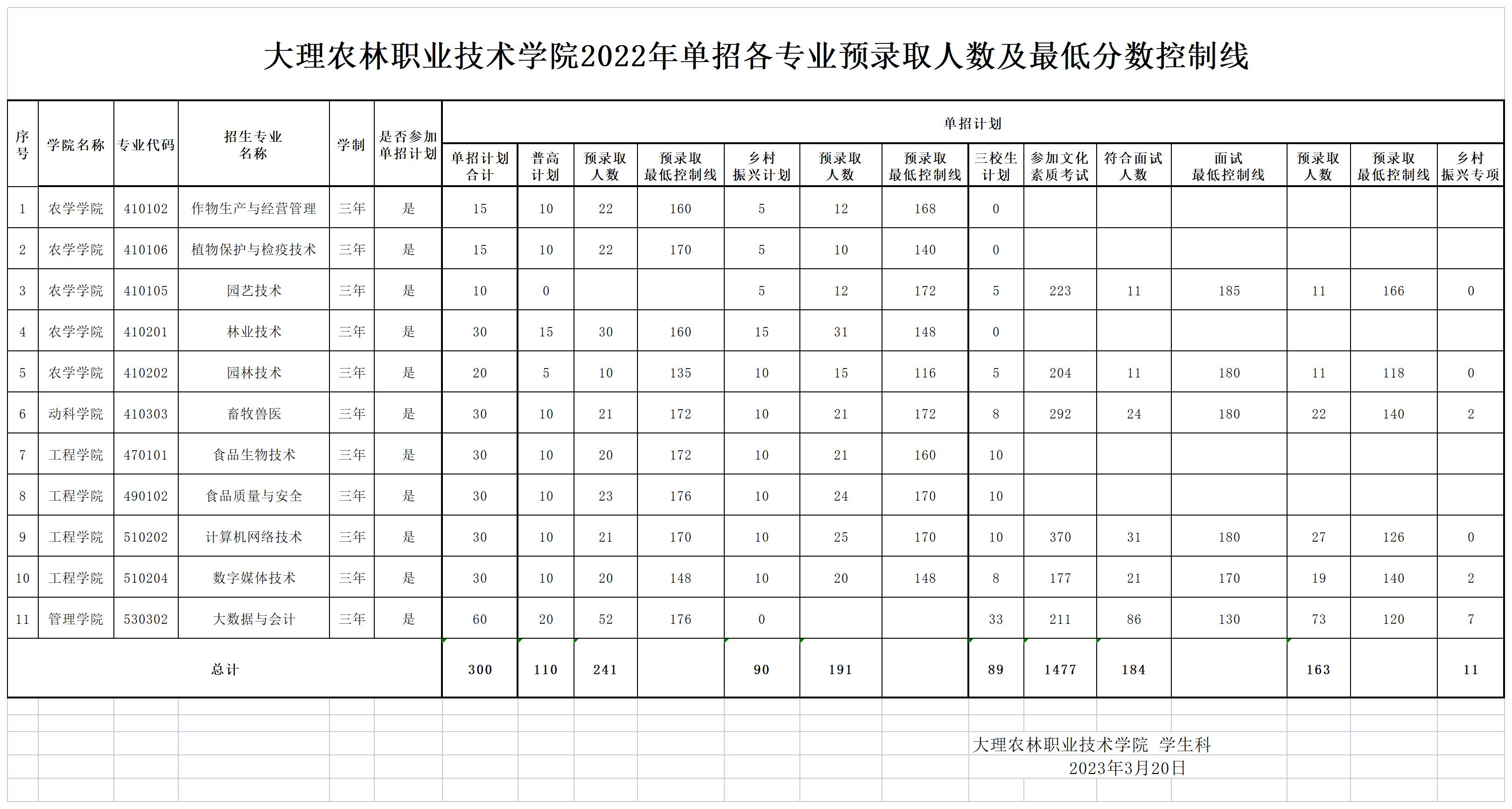 大理农林职业技术学院2022年单独招生最低录取分数控制线