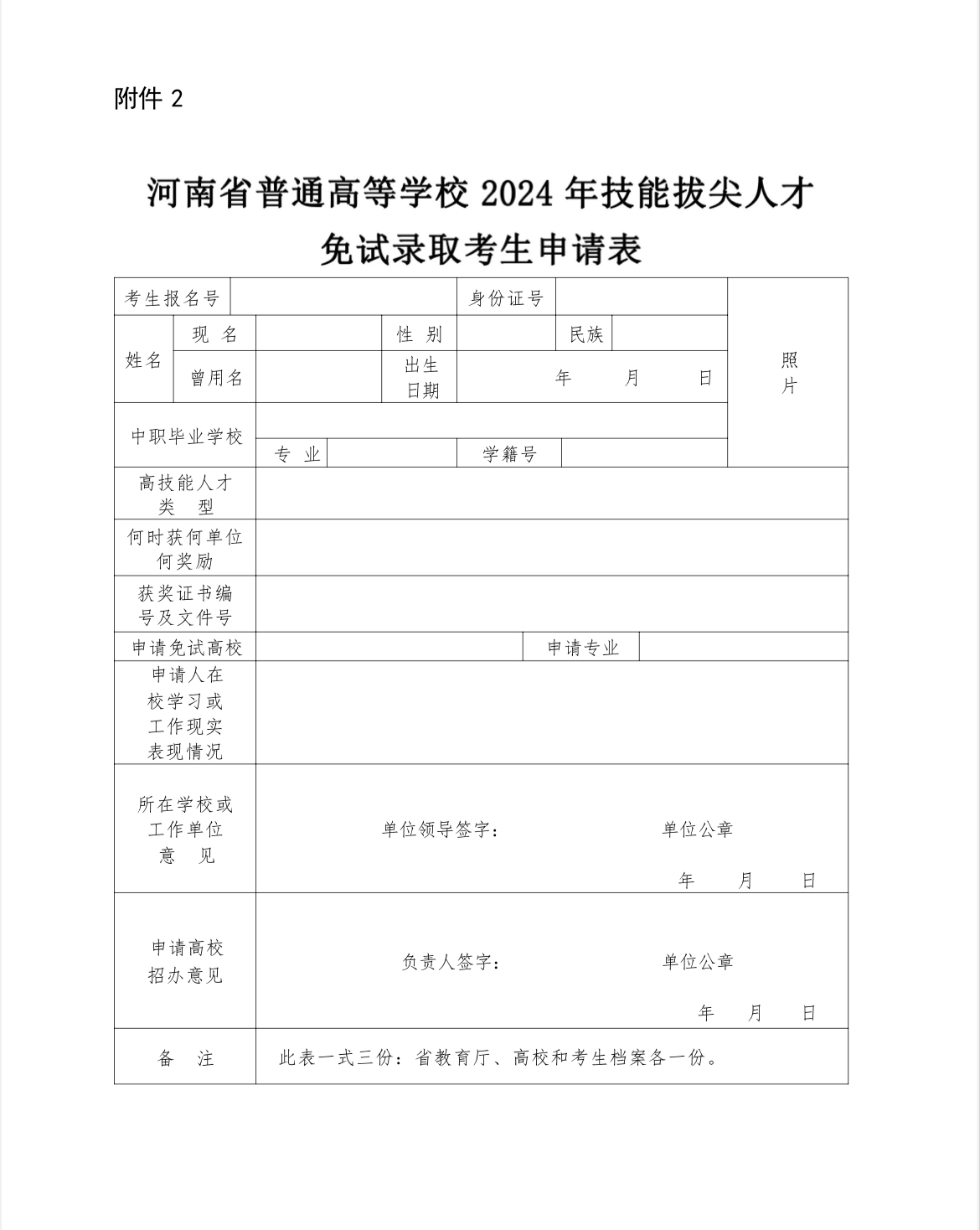 1.考生须填报我校单招志愿方可提出申请。考生本人在规定时间内填写《河南省普通高等学校2024年技能拔尖人才免试录取申请表》(详见附件),提出免试入学申请,由生源学校负责确认考生获奖情况,并签字盖章。
