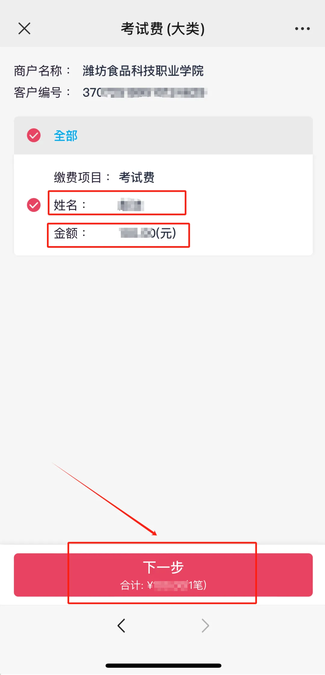 第二步,核对“姓名”、“金额”,无误后选中缴费项目,点击“下一步”。(若信息不符,请考生拨打0536-8161171。)