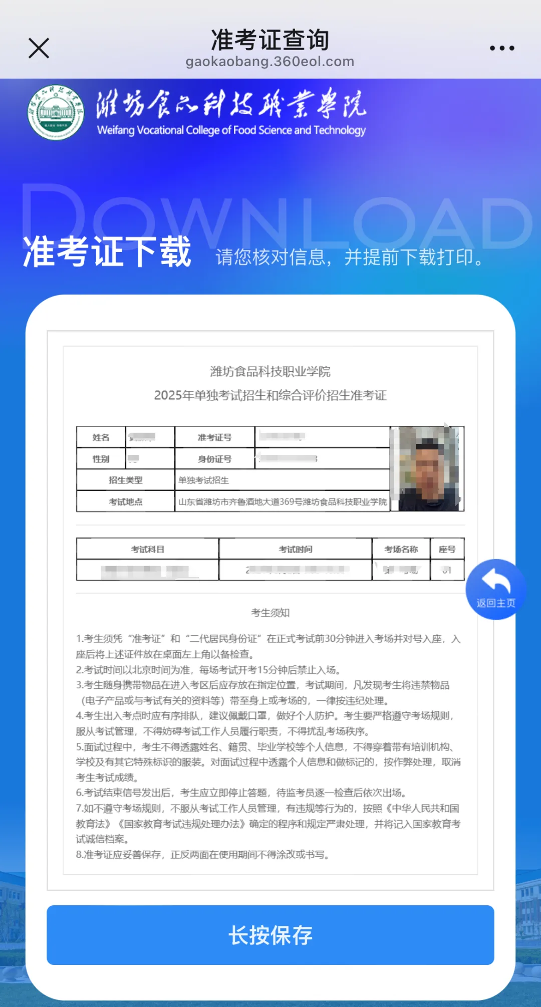 根据《山东省教育厅关于做好2025年高职(专科)单独考试招生和综合评价招生工作的通知》(鲁教学函〔2025〕1号)、《潍坊食品科技职业学院2025年高职(专科)单独招生和综合评价招生章程》等文件精神,现将我校2025年单招综评网上缴费及准考证打印安排如下: