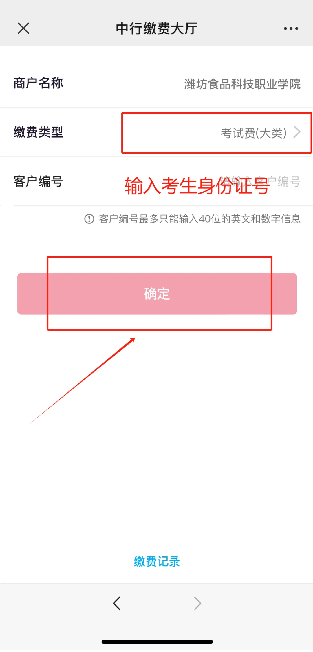 第一步,使用微信扫描上方二维码,进入中行缴费大厅。“缴费类型”选择“考试费(大类)”,“客户编号”处输入考生身份证号(X结尾大写),点击“确定”。