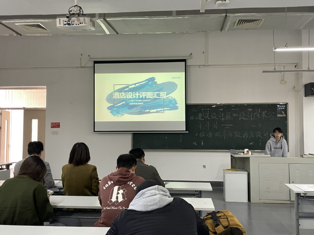 《滨海城市度假酒店设计》教学成果点评交流会上,学生李雨萍、韩颖彤、柳茗宇、庄耿彬、邹昀芯、王杰峰、许育源等先后上台汇报了自己的设计方案,之后企业设计师和主课教师先后分别对学生的汇报情况和成果表达进行评价,鼓励优点、指出缺点,发现不足给予建议和分析,通过企业设计师与同学们互动及答疑等现场教学,启发学生设计思维,帮助学生提升设计能力,学生与企业一线工作人员面对面近距离接触与互动,提高了对专业的认知和理解,对设计成果的存在两点得到企业专家的肯定而信息倍增,对设计成果存在的不足则在企业专家的点评下豁然开朗。